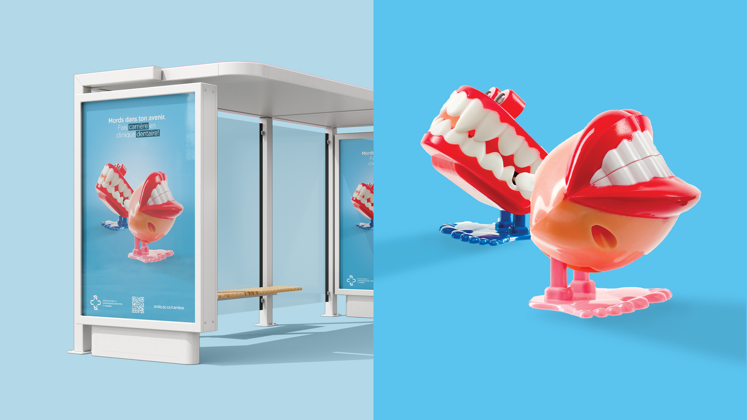 À la suite d’une démarche complète de marque employeur, l’ACDQ a décidé d’investir dans une campagne de notoriété et de valorisation dans le but de soutenir ses objectifs stratégiques en faisant rayonner la profession de la dentisterie au Québec. Suivant une étape de recherche et de stratégie basée sur les personas, leur perception actuelle de l’industrie et les biais reliés à la dentisterie, un sondage aux membres a été fait pour bien saisir les plus grandes forces du domaine et ainsi bâtir des messages de campagne provenant de la voix du personnel en clinique. La stratégie média a été basée sur les personas et leurs habitudes de consommation média, soit : réseaux sociaux, Google, Spotify, bannières numériques dans des environnements web propres aux intérêts de la cible, télé, télé numérique, radio, et affichage dans les abribus.