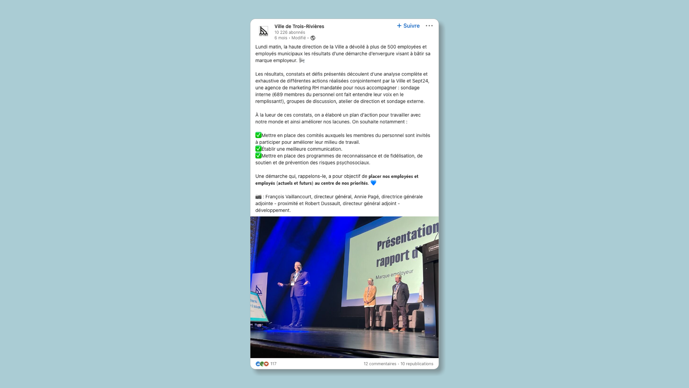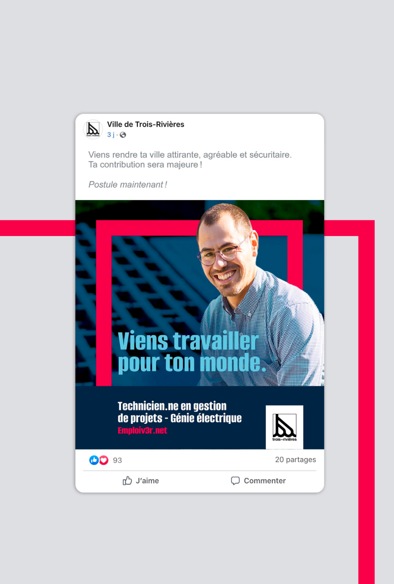 La Ville de Trois-Rivières souhaitait se positionner en tant qu’employeur de choix en vue de mobiliser et retenir leurs employé.es actuel.les en plus d’attirer les candidat.es nécessaires pour compléter leurs équipes.