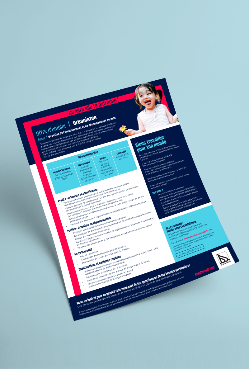 La Ville a transformé sa section Emplois avec les concepts de sept24 pour l’aligner à sa campagne et perfectionner son processus de recrutement. Maintenant, postuler en ligne est un jeu d’enfant. Du petit écran à l’écran géant, des réseaux sociaux aux journaux imprimés, en passant par les panneaux publicitaires, la radio et les placements numériques, une multitude de moyens de communication ont été déployés pour le lancement de cette campagne. De plus, en tant qu’employeur qui se préoccupe de ses employé.es, la Ville a fait les choses en grand avec un lancement interne en toute transparence.